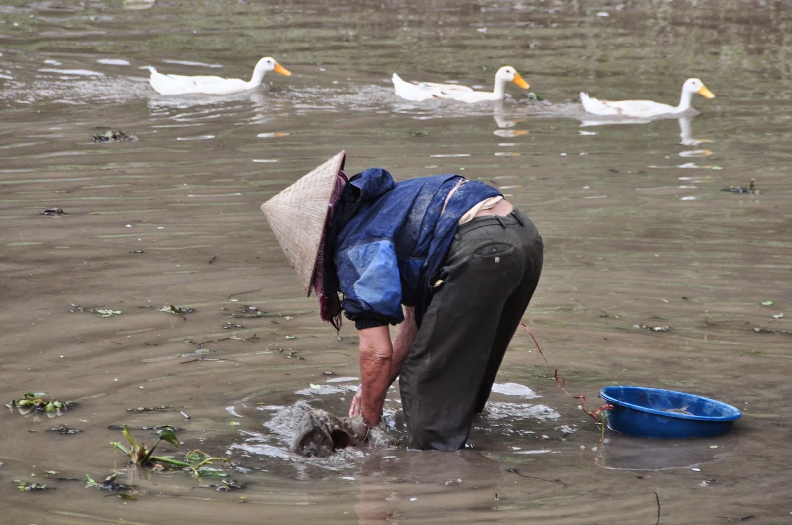vietnamienne est en train de chercher des coquillages dans la mare des canards.